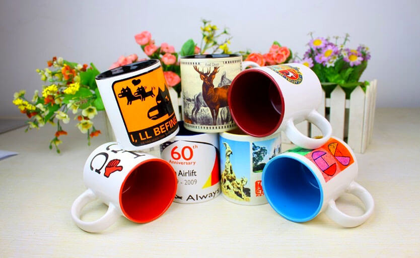 - Технология сублимационной печати. Ее можно увидеть на керамике или изделиях из синтетической ткани. Рисунок оказывается на поверхности изделия под воздействием пресса, что дает возможность получить яркие и объемные изображения.